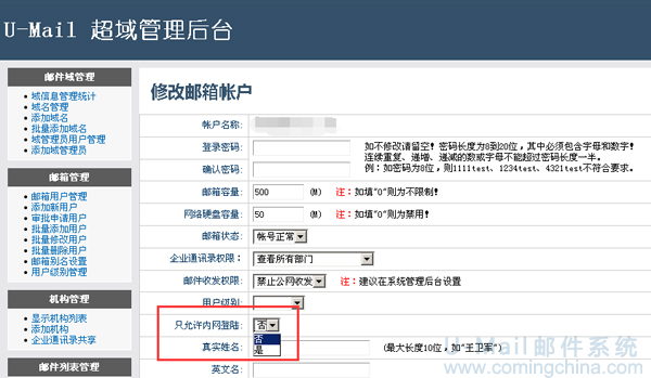 4.限制是否允許外網登陸網頁:有些人員郵箱賬號非常重要,為進一步確保安全,可限定只能在公司內網使用,登陸超域管理后臺——“郵箱帳號管理”,在下圖對話框中設置: