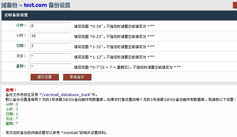 例:如您打算每月7號16:00進行“test.com域名”的郵件和數據庫備份,則設置如下圖(設置后點擊“提交設置”按鈕生效):