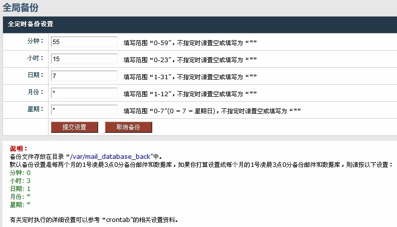 例:如您打算每月7號15:55進行“域”的郵件和數據庫備份,則設置如下圖(設置后點擊“提交設置”按鈕生效):
