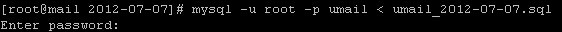 輸入mysql -u root -p umail < umail_2012-07-07.sql命令導入數據庫,并且提示輸入root帳號密碼,如下圖: