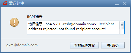 發送郵件提示“554 5.7.1 <zsh@domain.com>: Recipient address rejected: not found recipient account!”,如下圖: