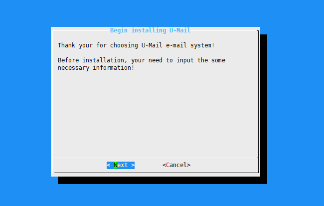 11、進(jìn)入系統(tǒng)后,第一次會自動彈出U-Mail向?qū)Вx擇Next回車,如下圖: