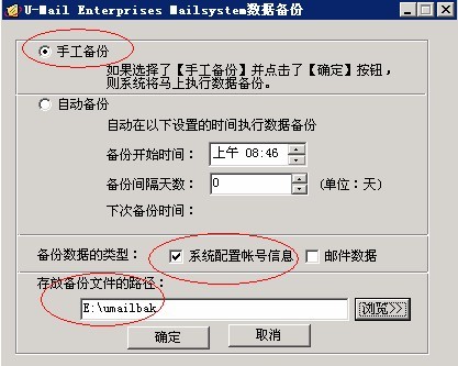 (2)使用U-Mail自帶的備份功能,對(duì)“系統(tǒng)配置帳號(hào)信息”進(jìn)行備份,如下圖: