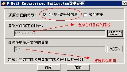 (6)使用U-Mail自帶的還原功能,對(duì)“系統(tǒng)配置帳號(hào)信息”進(jìn)行還原,如下圖: