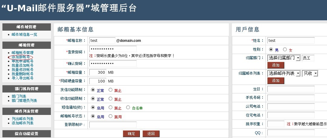 系統管理后臺:http://mail.domain.com/webmail/admin/ 帳號:system(U-Mail系統方面設置)