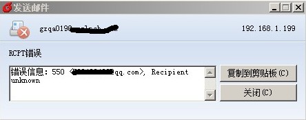 客戶端工具發送郵件提示“550 <郵箱>,Recipient unknown”,如下圖: