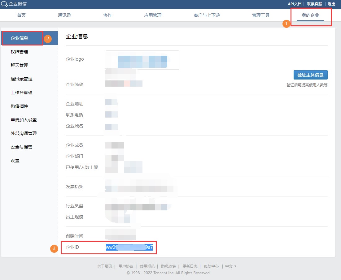 在企業(yè)微信管理后臺中獲取CorpID ( 企業(yè)ID ) 并記住, 后續(xù)步驟需要用到