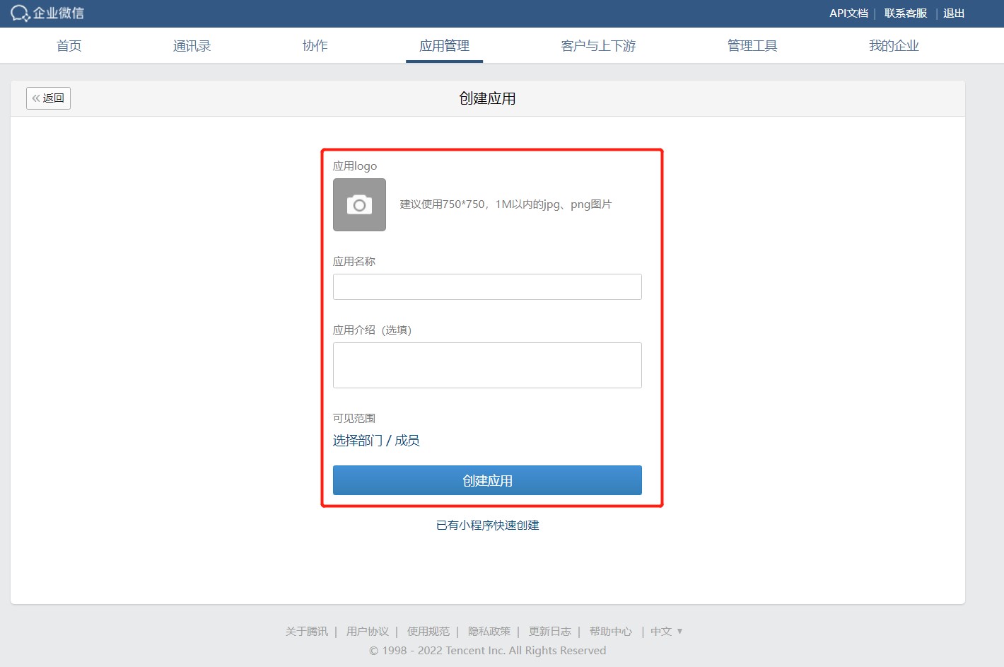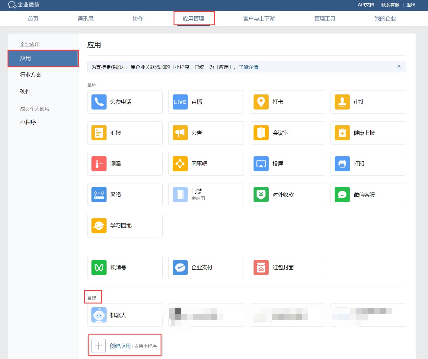 在“企業(yè)微信管理后臺 => 應(yīng)用管理 => 應(yīng)用 => 自建”中創(chuàng)建應(yīng)用,如下圖: