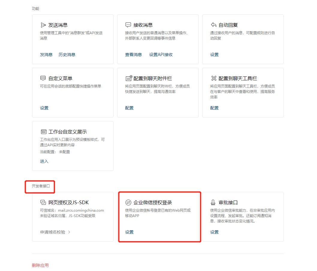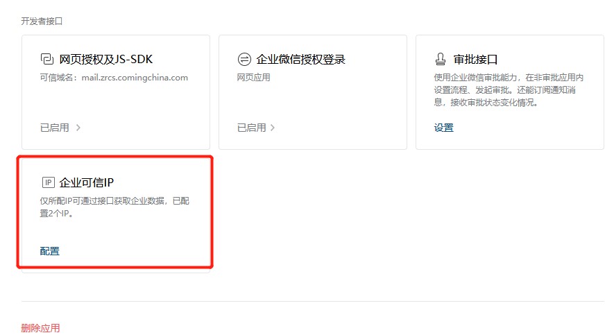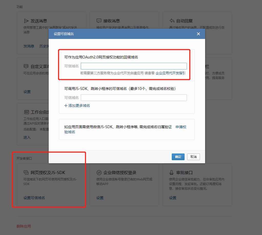 應(yīng)用創(chuàng)建好之后, 劃到應(yīng)用配置下邊, 打開“開發(fā)者接口 => 網(wǎng)頁授權(quán)及 JS-SDK”,設(shè)置可信域名,填寫您郵箱的二級域名 (如: mail.domain.com ):