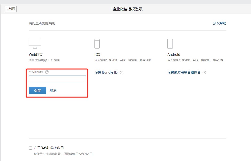 在“開發(fā)者接口 =>企業(yè)微信授權(quán)登錄”設(shè)置“Web 網(wǎng)頁授權(quán)回調(diào)域”, 填寫您郵箱的二級域名 (如: mail.domain.com)