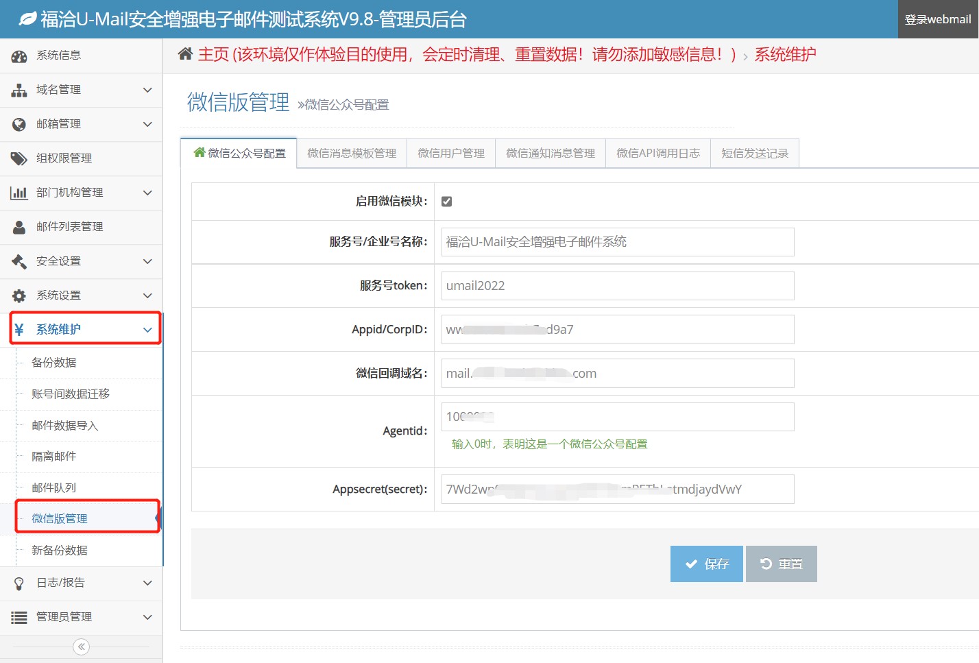 在“管理后臺 => 系統(tǒng)維護(hù) => 微信版管理”參數(shù)設(shè)置中, 輸入