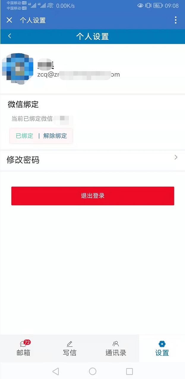 d)在“設(shè)置”界面, 可綁定企業(yè)微信, 綁定后可在電腦端網(wǎng)頁上掃碼登陸郵箱