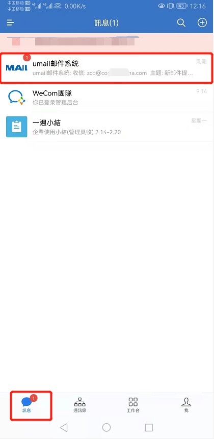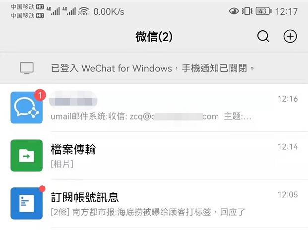b) 如果“個(gè)人微信”關(guān)聯(lián)了“企業(yè)微信”, 個(gè)人微信也會有新郵件提醒