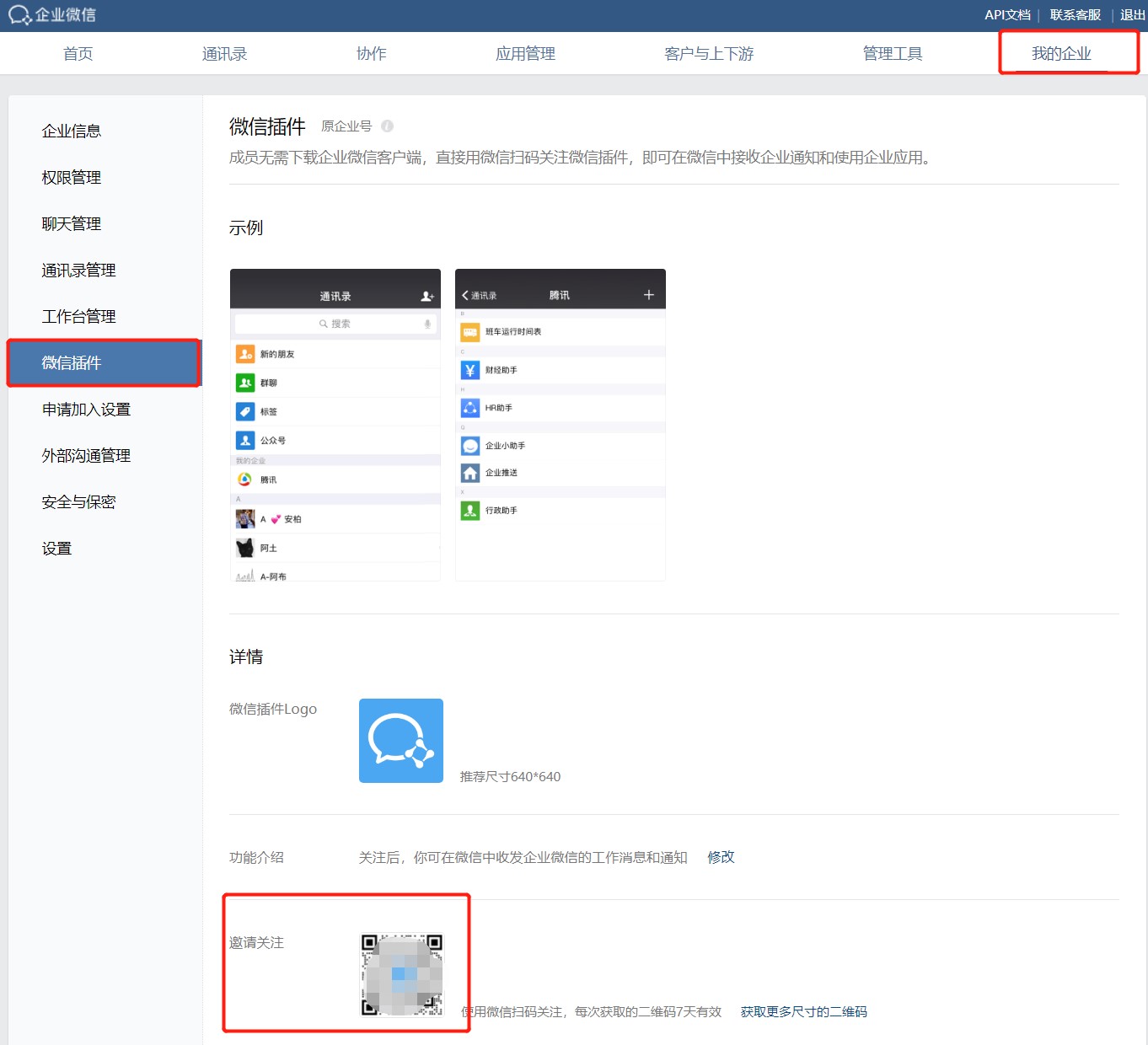 a) 首先登錄企業(yè)微信管理后臺,進(jìn)入‘我的企業(yè)’---‘微信插件’, 將二維碼給用戶掃描