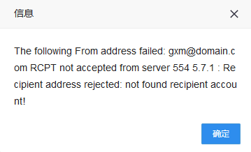 問題描述: 發送郵件提示“RCPT not accepted from server 554 5.7.1 : Recipient address rejected: not found recipient account! ”,如下圖: