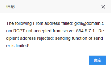 webmail發送郵件提示“RCPT not accepted from server 554 5.7.1 : Recipient address rejected: sending function of sender is limited! ”,如下圖: