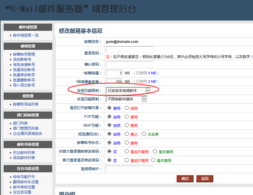 郵箱管理員,登錄到域/超域管理后臺(郵箱管理---郵箱帳號管理)查看修改發送權限,如下圖: