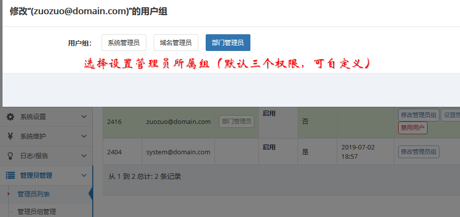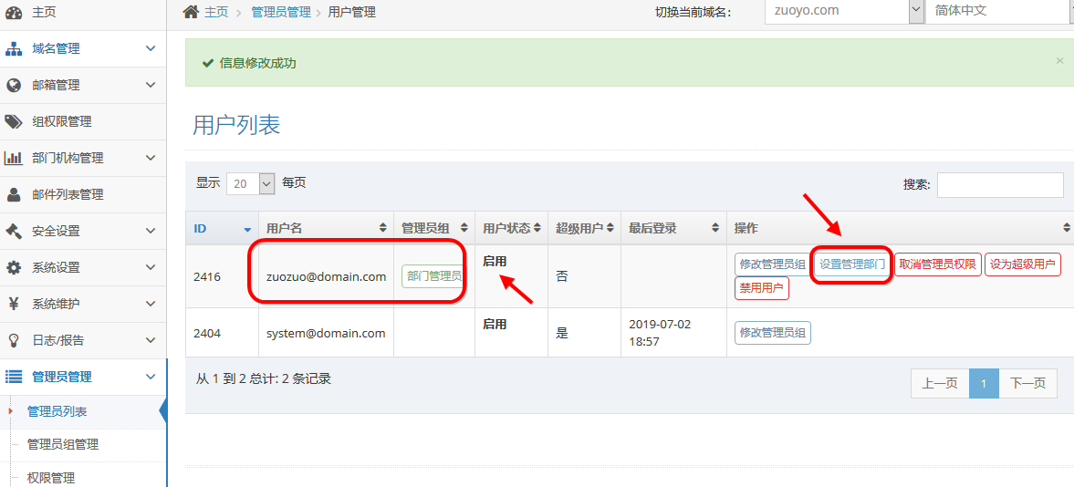首先需要找到需要設置部門管理員的用戶,注意右上角可以切換域名。選中用戶,點擊“設置為管理員”