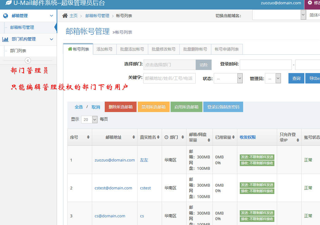 登錄進去之后,如圖。左側可以查看剛剛授權的部門 機構了,部門管理員提供了管理 刪除 修改本部門下的郵箱用戶的權限。如需其他擴展功能,可以添加自定義管理員組,授權其他管理權限。具體操作咨詢u-mail技術支持