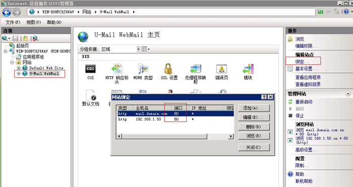 1. 登陸到服務(wù)器上在開始—設(shè)置—控制面板—管理工具—雙擊(Internet 信息服務(wù)(IIS)管理器)然后選到U-Mail WebMail,在右邊點擊綁定把里面默認的80修改成你所需要的端口號即可。如圖: