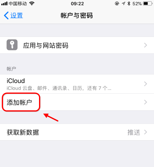 3 [賬戶與密碼]菜單,選擇添加郵箱賬號