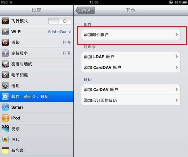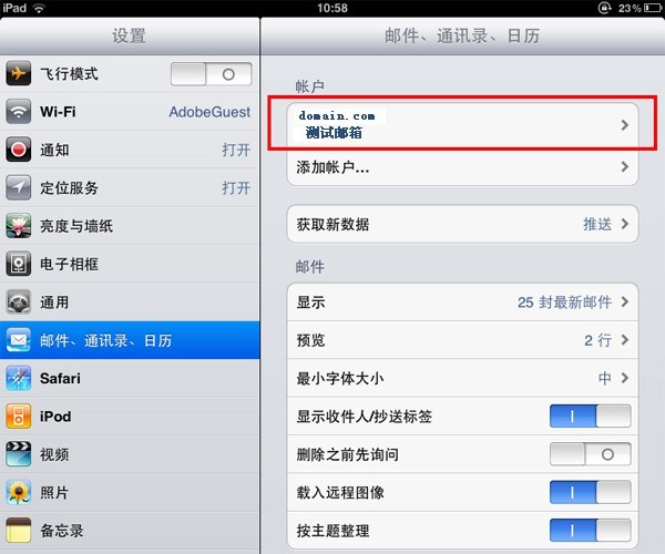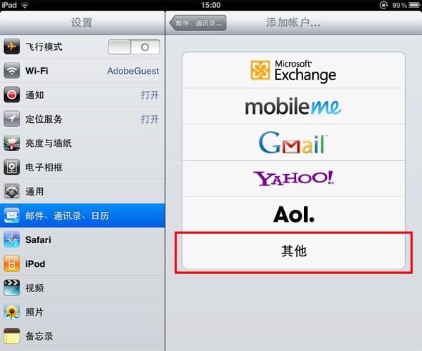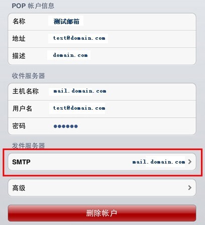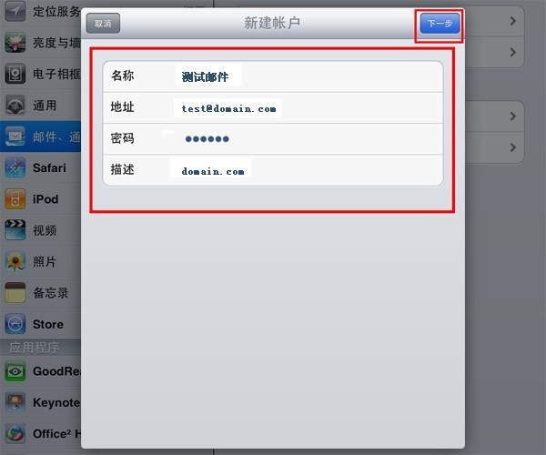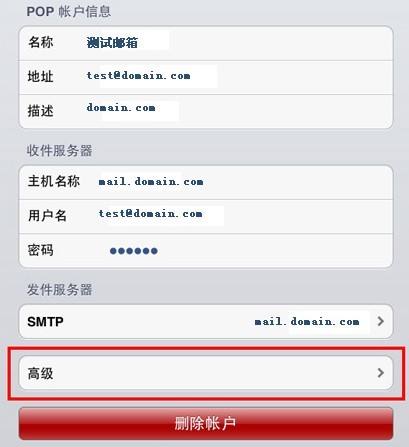 以下以iPad為例,設置POP3方式收發郵件。如果想使用IMAP方式,配置的時候選擇IMAP協議,并把接收服務器的端口改成143接口,其它設置和POP3設置大致類似。其它移動設備的設置步驟可參照此處。