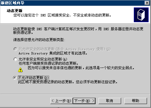 7.動態(tài)更新:選擇“不允許動態(tài)更新”,如果是在域的環(huán)境下一定要選擇允許動態(tài)更新。單擊下一步